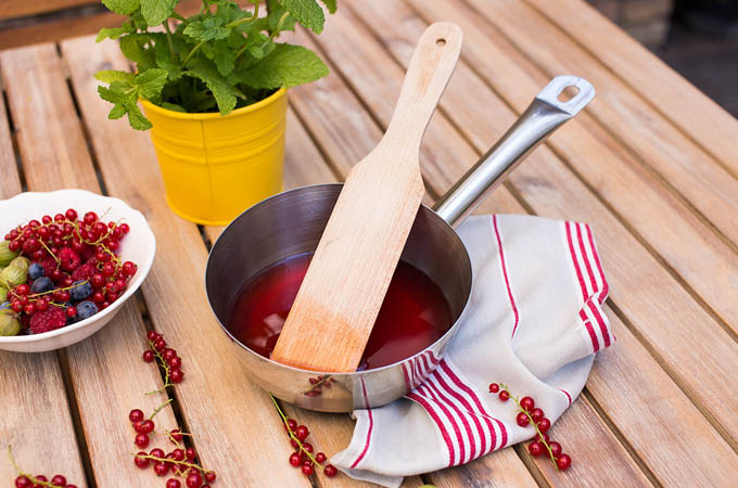 Uvaríme vodu s cukrom, primiešame ½ balenia červeného želé, prevaríme a necháme vychladnúť.