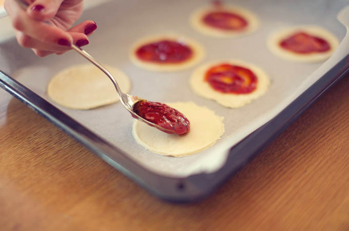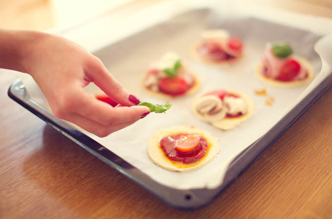 Na minipizze ukladáme kúsky paradajok, mozzarelly, mäsa (či iných ľubovoľných surovín, napríklad kukurice, šampiňónov či ananásu).
