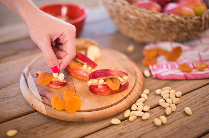 Preložíme ďalším mesiačikom jablka, vytvoríme tak zábavné ústa. Pozdĺžne prekrojené sušené marhule môžeme použiť ako jazyk.