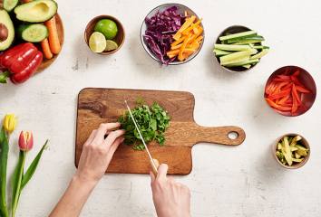 Zeleninu nakrájame na tenké rezančeky, koriander nadrobno nasekáme, šalátové listy rozdelíme na polovicu.