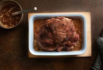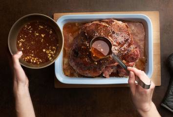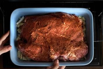 Mäso po hodine pečenia zalejeme marinádou, znížime teplotu na 160 °C a pečieme ešte asi 2,5 – 3 hodiny, kým sa pliecko nedá vidličkou ľahko trhať.