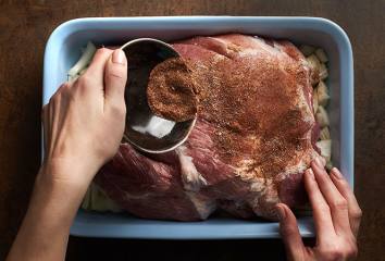 Mäso potrháme, odstránime prípadné tukové časti a podávame s BBQ omáčkou alebo horčicou v žemli, prípadne s čerstvým chlebom alebo zemiakmi. Tip: Nakoreňte mäso noc pred pečením, získa výraznejšiu chuť.