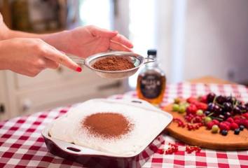 Vychladené tiramisu štedro posypeme kakaom a ozdobíme jahodami.