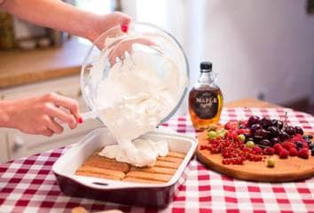 Pripravíme krém do tiramisu: vyšľaháme mascarpone, jogurt, javorový sirup. Polovicu krému vylejeme na piškóty a naukladáme naň plátky nakrájaného ovocia.