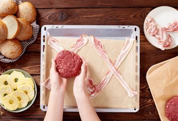 Pásy slaniny po dvoch uložíme na plech do tvaru písmena X.