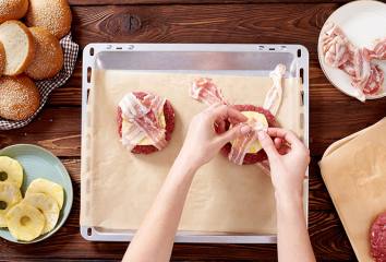 Pásy slaniny preklopíme koncami cez mäso a ananás a hore v strede upevníme špáradlom.