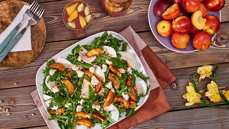 Pri grilovačke ešte chvíľu zostaneme. Spolu s broskyňami pogrilujte aj nektárinky, zmiešajte ich s rukolou, reďkovkami, kozím syrom a vegetariáni, ako aj všetci, ktorí si strážia líniu, vám budú za tento teplý šalát ruky bozkávať.