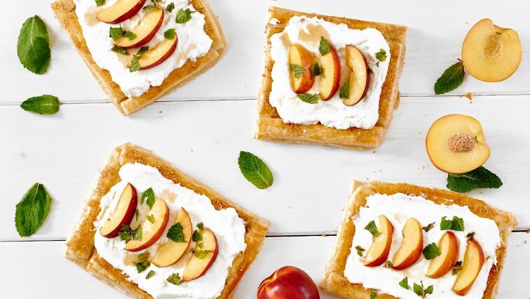 Ďalším tipom na rýchly dezert sú jednoduché štvorce z krehkého cesta, potreté tvarohovou nátierkou a ozdobené ovocím. Namiesto nektáriniek odporúčame aj broskyne, ringloty, čerešne, čučoriedky či jahody.