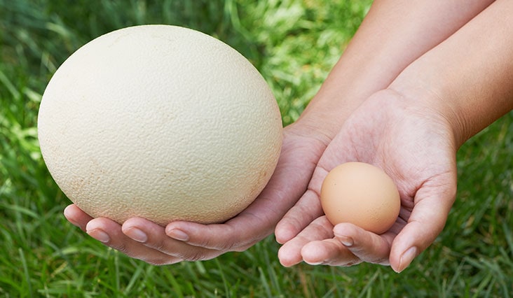 Jedno pštrosie vajíčko zasýti až desať hladných krkov. Bodaj by nie, veď veľkosťou 15 cm a váhou okolo 1,5 kg nahradí až 30 slepačích vajec. Takéto veľké vajce si vyžaduje aj dostatočne dlhé varenie – 1 až 1,5 hodiny. Pštrosie vajcia sú bohatšie na železo a kyselinu listovú, majú menej medi a zinku.