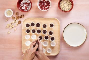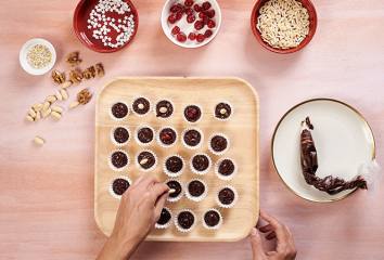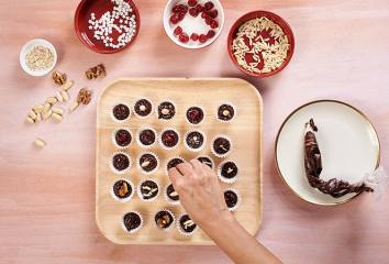 Naplníme polovicu, vložíme náplň podľa chuti – arašidové maslo, bielu čokoládu, kešu, oriešok, mandľu, cukrík, hrozienka, brusnice atď a zalejeme čokoládovou masou.