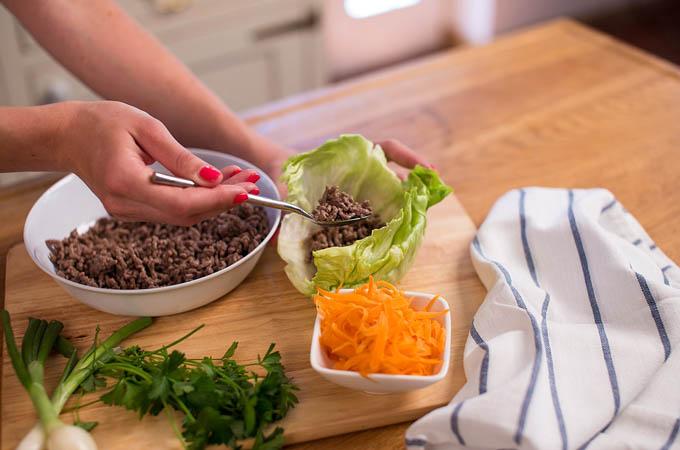 Mäso udusíme na oleji a jednoducho ochutíme soľou a korením. Na jeden šalátový list nám postačia dve lyžice hotového mäsa.