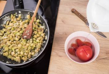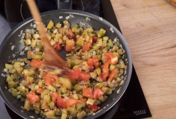 Keď všetko približne po 3 minútach zmäkne, pridáme ošúpané paradajky, premiešame a chvíľu dusíme.