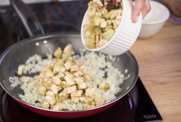 Cibuľu pražíme na olivovom oleji, kým nezmäkne a následne pridáme baklažán a soľ.
