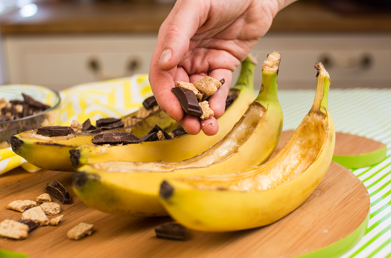Banán plnený čokoládou a sušienkami upečený na grile? Spokojné brušká zaručené!