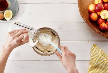 Nektárinky umyjeme a nakrájame na tenké plátky. Vrch naplnených vaničiek s plátkami nektárinky pokvapkáme sirupom a servírujeme.