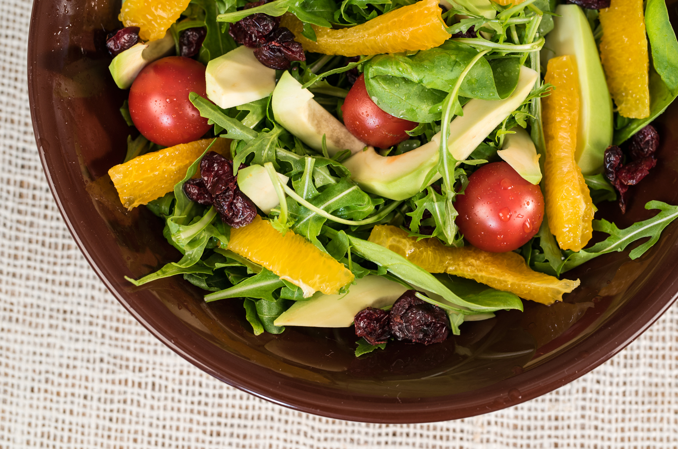 Špenát uložíme na dno šalátovej misy, pridáme prepolené paradajky a na kocky nakrájané avokádo. Pomaranč ošúpeme a rozdelíme ho nožom na tenké mesiačiky bez šupky, tzv. filetky. Posypeme brusnicami a podrvenými vlašskými orechmi.