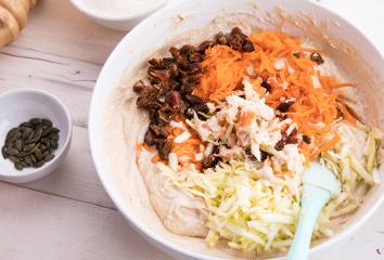 Následne pridáme cuketu, mrkvu a datle.