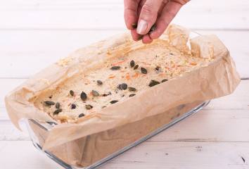 Formu naplníme zmesou a posypeme tekvicovými semienkami.