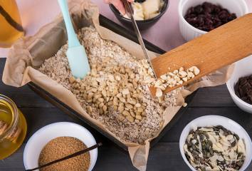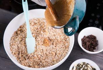 Zmes dáme do misky s mandľami a ovsenými vločkami. Dobre premiešame a necháme trocha vychladnúť.