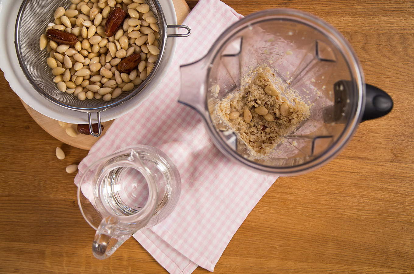 Datle, samozrejme, mixujeme bez kôstok. Ak použijeme med alebo sirup, stačí ich pridať na záver alebo do mixovania. Mandle a datle dáme spolu s 2,5 šálkami vody do mixéra a môžeme začať mixovať. Najprv mixér párkrát zapneme a vypneme, aby sa mandle trošku rozdrvili, potom ho necháme pustený približne 4 minúty (po dvoch minútach dáme mixéru radšej pauzu).