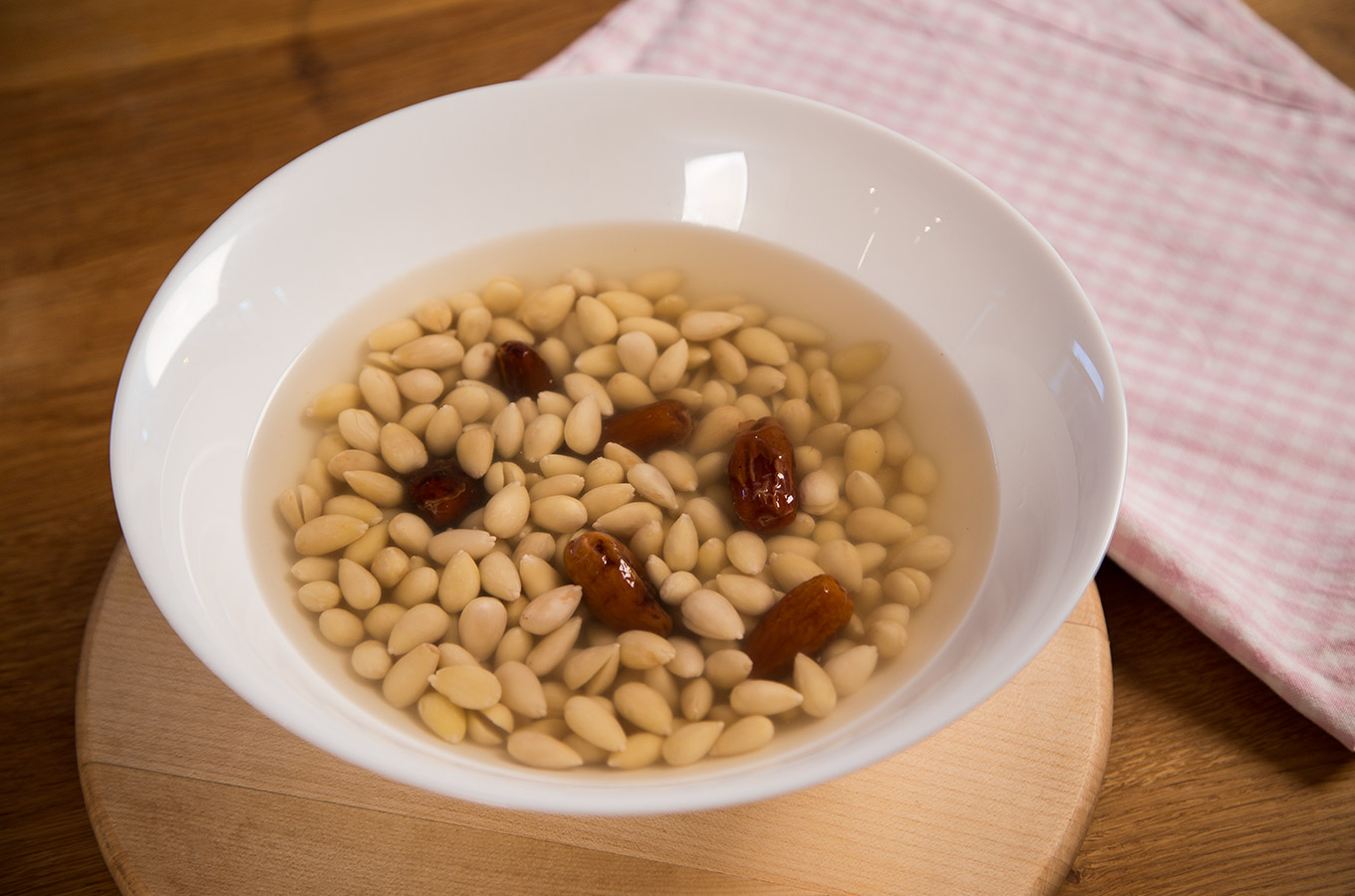 Mandle na noc namočíme do vody. Ak chceme mať mlieko trošku sladké, večer namočíme spolu s mandľami aj sušené datle, aby dobre zmäkli.