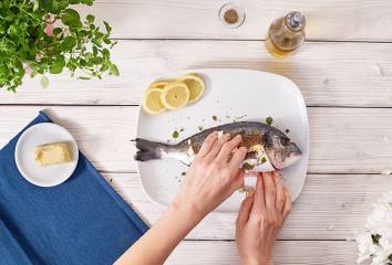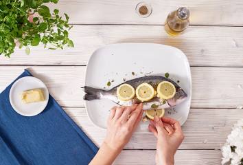 Grilovaná ryba ochutená citrónom a bylinkami a zemiaky s rozmarínom sú dokonale chuťovo zladený pár.