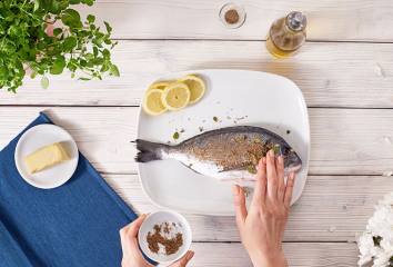 Ryba: Rybu dobre umyjeme, môžeme odstrániť plutvy a osušíme ju. Citrón dobre umyjeme, nakrájame na kolieska. Koreniny a soľ zmiešame a zmesou posypeme rybu zvnútra aj zvonka.