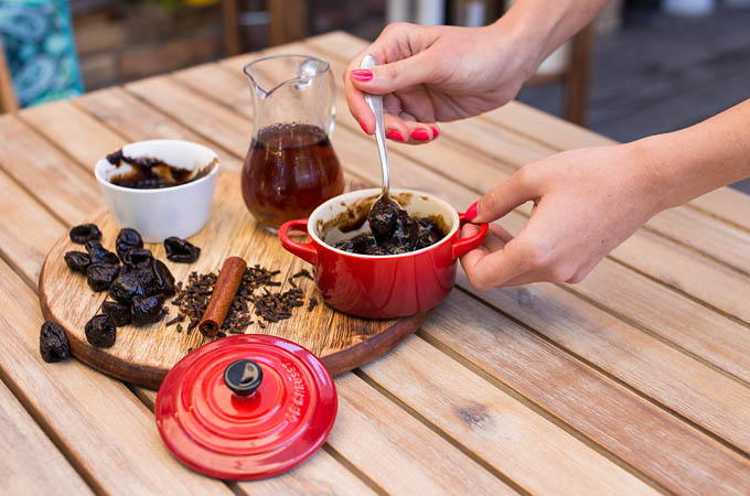 Kým sa pečie, pripravíme omáčku. Slivkový džem, sušené slivky, klinčeky, mletú škoricu a rum povaríme. Na zriedenie môžeme pridať trochu sladkej smotany. Vytiahneme klinčeky aj škoricu a všetko rozmixujeme na hladkú omáčku, ktorú dochutíme soľou a korením.