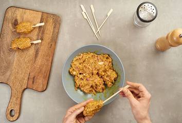 Z mäsovej hmoty vytvoríme menšie guľky, ktoré napichneme na špajdle.