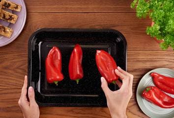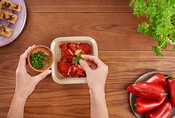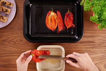 Pripravíme paprikový šalát: rúru nahrejeme na 200 °C. Medzitým umyjeme papriky a uložíme ich na plech. Celé papriky pečieme asi 15 – 20 minút, kým nie sú mäkké – v polovici pečenia ich môžeme otočiť. Na niektorých miestach môže šupka sčernieť, ale nesmie popraskať. Opečené papriky uložíme na 15 minút do mikroténového vrecka, aby zvlhli.