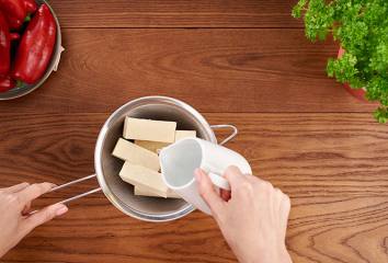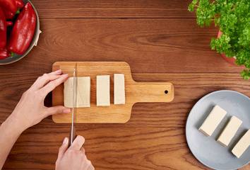 Rozkrojíme tofu pozdĺžne na dve polovice alebo ho nakrájame na plátky hrubé asi 2,5 - 3 cm.