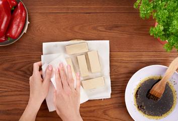 Plátky tofu položíme na papierovú servítku s drsným povrchom a jemne ich vysušíme.