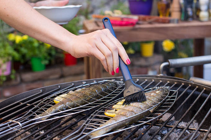 Grilujeme v kliešťoch na ryby alebo vcelku v alobale. Počas grilovania potierame olivovým olejom.