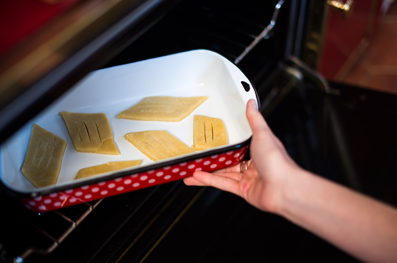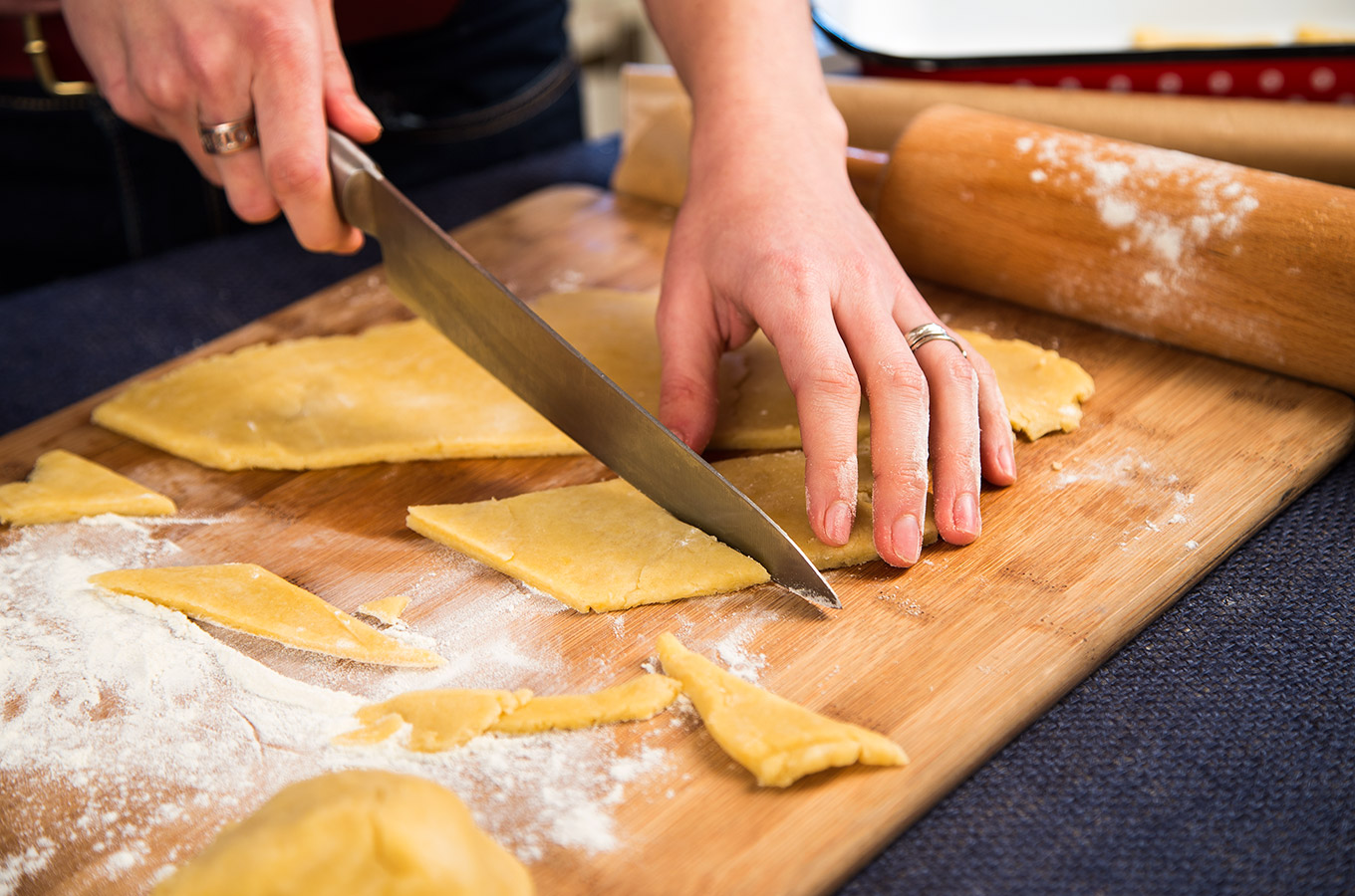 Zo všetkých surovín vymiesime vláčne cesto, ktoré vyvaľkáme na hrúbku asi 4 mm. Rozrežeme ho na štvorce. Každý štvorec v strede prekrojíme a uložíme na plech, ktorý sme vopred vyložili papierom na pečenie.
