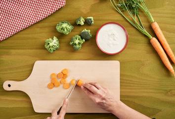 Očistenú brokolicu a mrkvu nakrájame na menšie kúsky, jedno menšie koliesko mrkvy dáme bokom a prekrojíme na polovicu.