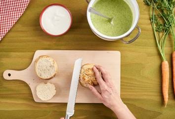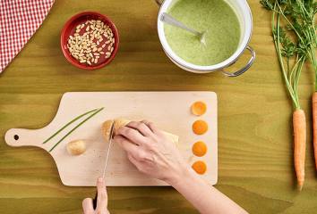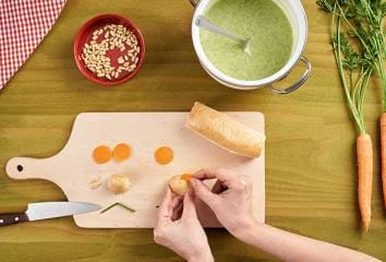 Z orieškov spravíme oči, z pažítky fúziky a z mrkvy ušká. Hlavu zajačika položíme na hranu spodnej misky. Zajka položíme na tanier, ozdobíme petržlenovou vňaťou a servírujeme v ňom polievku. Tip: Namiesto žemle môžete použiť aj malý guľatý chlieb a hlavičku spraviť zo žemle.