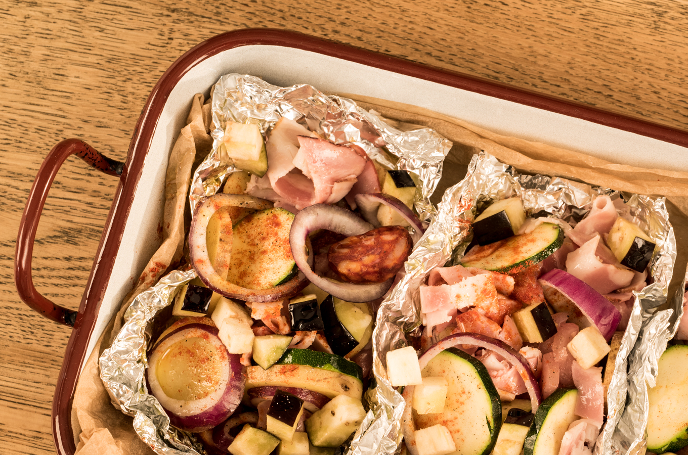 Do alobalu navrstvíme zeleninu, zemiaky, plátky slaniny, mäso, cibuľu, klobásku, znova plátky slaniny a nakoniec zemiaky. Alobal uzatvoríme a dáme do pahreby, prípadne na plech. Pečieme približne 45 až 60 minút pri teplote 200 °C.