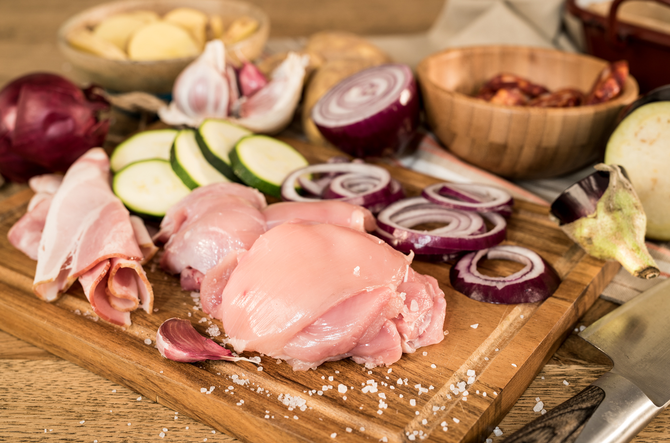 Mäso nakrájame na menšie kúsky, osolíme, okoreníme a potrieme olivovým olejom spolu s cesnakom. Cuketu aj so šupkou nakrájame na plátky, baklažán ošúpeme a nakrájame na kocky. Zemiaky, klobásku a cibuľu nakrájame na plátky, cesnak roztlačíme.