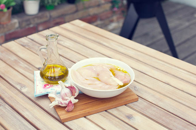 Kuracie prsia marinujeme 30 minút v zmesi oleja, cesnaku, soli a korenia.