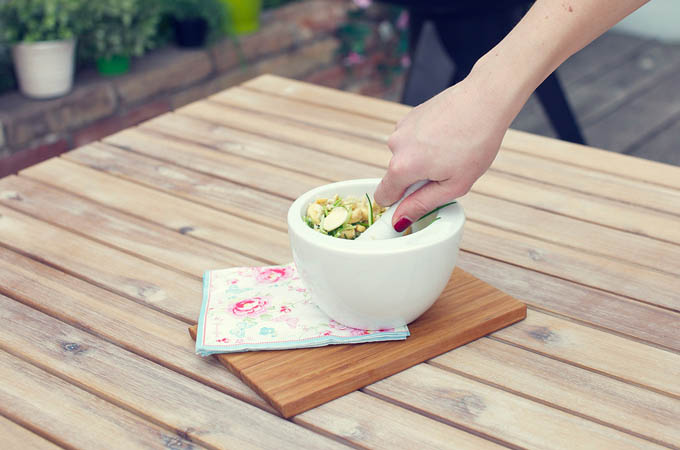 Zatiaľ si pripravíme pesto, na ktoré v mažiari alebo v kuchynskom mixéri zmixujeme všetky ingredencie dohladka.