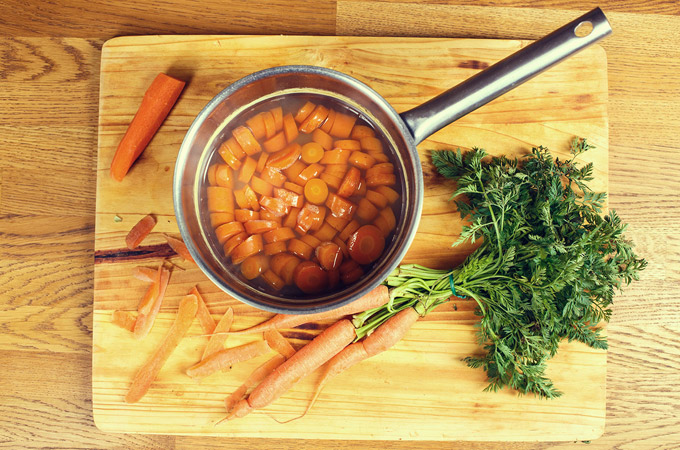 Mrkvu ošúpeme a nakrájame na kolieska, ktoré dáme variť do vody so štipkou soli.