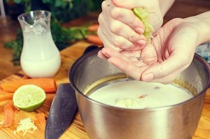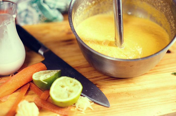 Keď je mrkva dostatočne mäkká, zlejeme väčšinu vody a pridáme limetu, zázvor, kokosové mlieko a mascarpone.