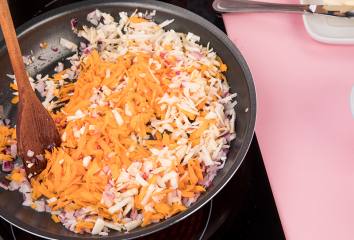 Na panvicu dáme maslo, necháme ho roztopiť a zeleninu restujeme, kým nezmäkne.