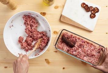 Vymastíme si formu na chlebík. Do formy dáme polovicu mäsovej hmoty.