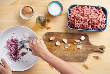 Cibuľu pokrájame, cesnak pretlačíme.