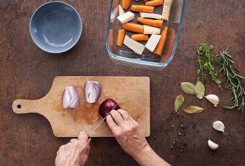 Rúru vyhrejeme na 200 °C. Nakrájame očistenú cibuľu, mrkvu a petržlen.