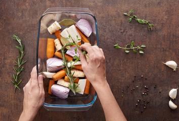 Na dno veľkej panvice, hrnca alebo hlbokého plechu rozložíme zeleninu, bylinky a cesnak.