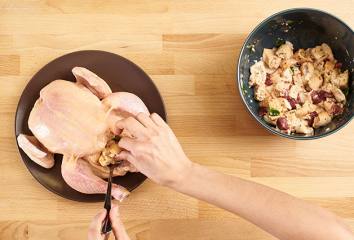 Kurča umyjeme, očistíme a posolíme. Plnkou plníme otvor v kurčati aj priestor pod kožou. Kurča v pekáči podlejeme trochou vody a pečieme pri 190 °C asi hodinu. Počas pečenia polievame výpekom.