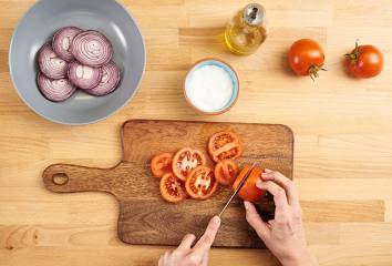 Upečené kurča s plnkou naporciujeme a podávame s varenou ryžou a zeleninovým šalátom: Paradajky aj cibuľu nakrájame na tenké plátky, pridáme olej a posolíme. Dochutíme soľou a korením. Tip. Zvyšnú plnku upečieme v kastróliku alebo vedľa kuraťa v pekáči.