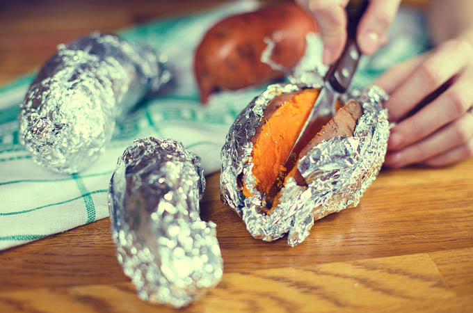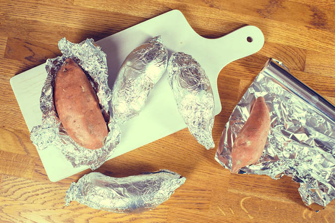 Každý zemiak individuálne zabalíme do alobalu. Vložíme do vyhriatej rúry (môžeme použiť teplovzdušné pečenie) a pečieme asi 60 minút pri teplote 200 °C.